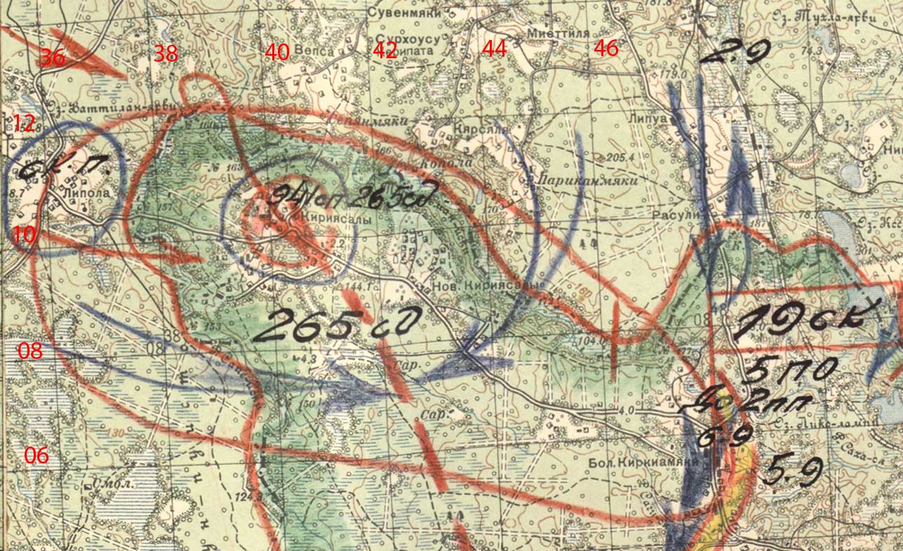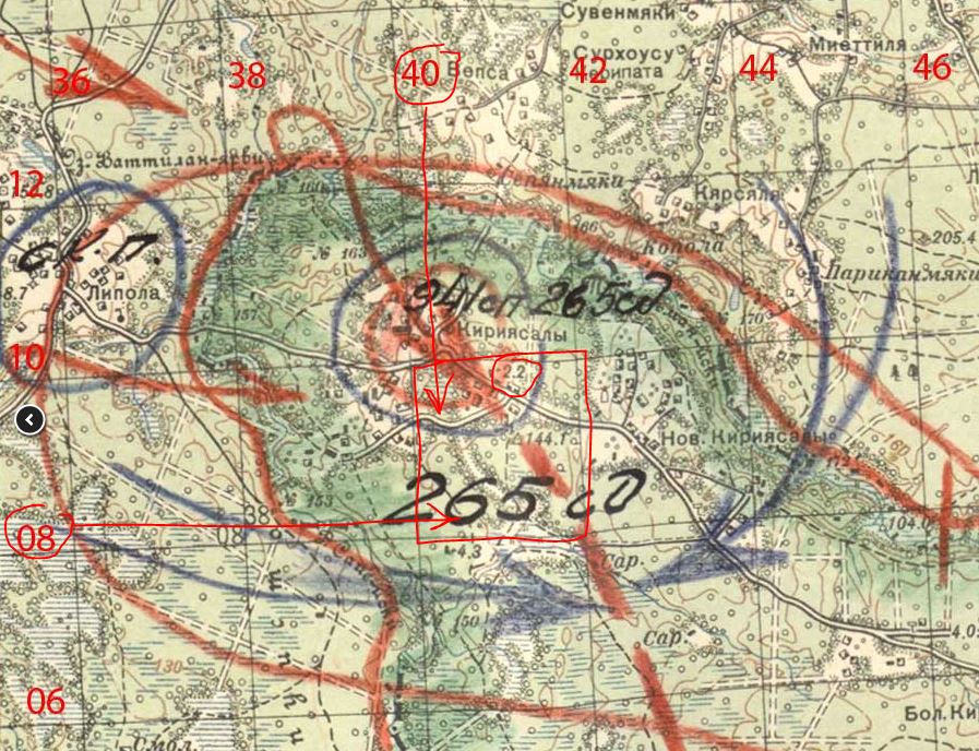 Цитата:535 ОЗАД занимает участок обороны от отметки погранзнака 172 до буквы Р, расположенной строго на север от буквы Ы наименования Кирьясалы.