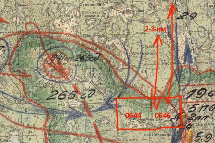 Вот эта точка - (0844) - выпадает из текста, так как после корректировки оказывается на территории занятой финнами, а без корректировки получается что финны долбили болото за ручьем Вязким (Суо-йоки) в километре от наших позиций.