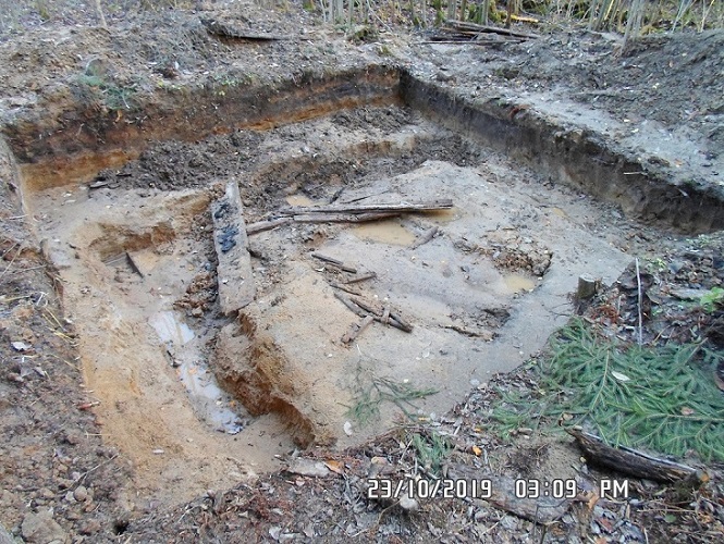 Рядом с восточной пограничной канавой (в районе её середины) выкопана большая яма. На дне ямы валяются гнилые доски: