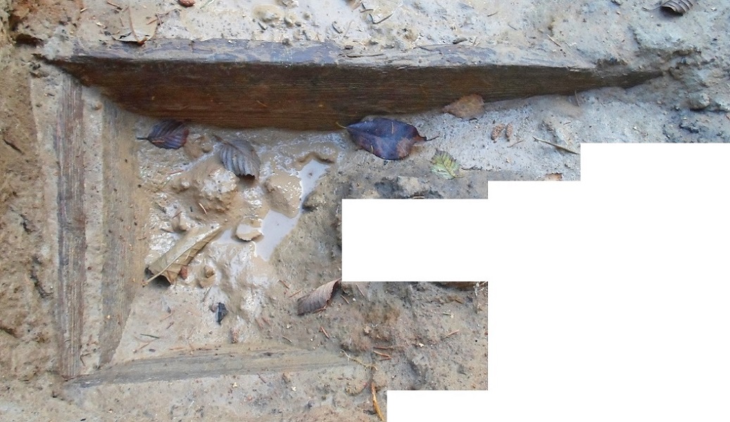 На дне ямы виден деревянный объект малого размера. Возможно, что это гроб для младенца: