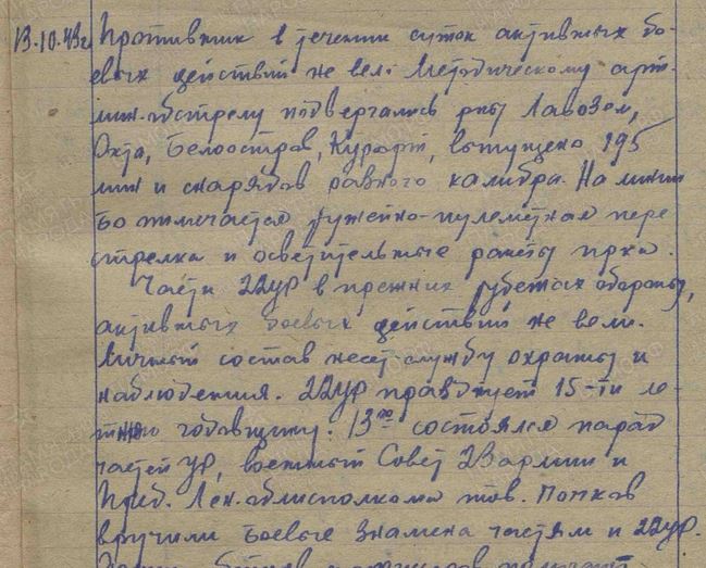 А ниже - фрагмент журнала боевых действий 22-го УРа (КаУРа) за 13 октября 1943 года.