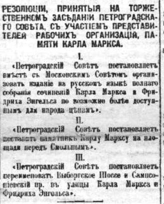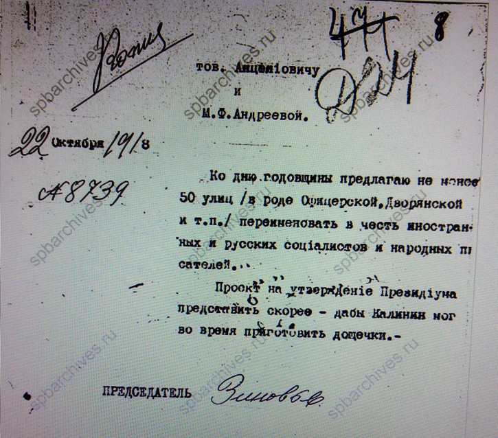 А может и не только. Ведь Зиновьев пишет Калинину 17 числа с просьбой распорядиться о переименовании, а не просто таблички поменять. Я поверил тёте Вике - мол, Калинин Цитата:после роспуска Петроградской городской думы в августе 1918 года возглавил Комиссариат городских хозяйств Союза коммун Северной области и Петроградской трудовой коммуны. А ведь это не совсем так. Упразднена Дума и городская управа были только через два дня после письма Зиновьева Калинину - 19 сентября 1918 года и тогда и возник Комиссариат горхозов СКСО. Но если Дума фактически к тому времени уже давно не существовала, то управа во главе с Калининым вполне себе работала как орган, руководивший коммунальным хозяйством до роспуска. Вот нужна ли его была его виза как формального городского головы для решения вопроса - это интересно, хотя и сомнительно - времени слишком немного прошло до нижеследующего упоминания.