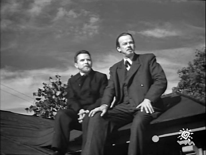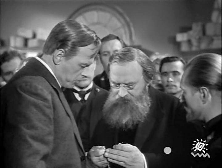 Это последний кадр фильма, снятый на улице. Далее идет визит Рыбкина в ЭТИ, арест полицией студентов, в т.ч. С.Я.Лифшица (известен первыми попытками передавать по радио речь еще в 1903 году), вызов Попова к министру внутренних дел Дурново. Фильм заканчивается избранием Попова председателем физического отделения РФХО в декабре 1905 года.
