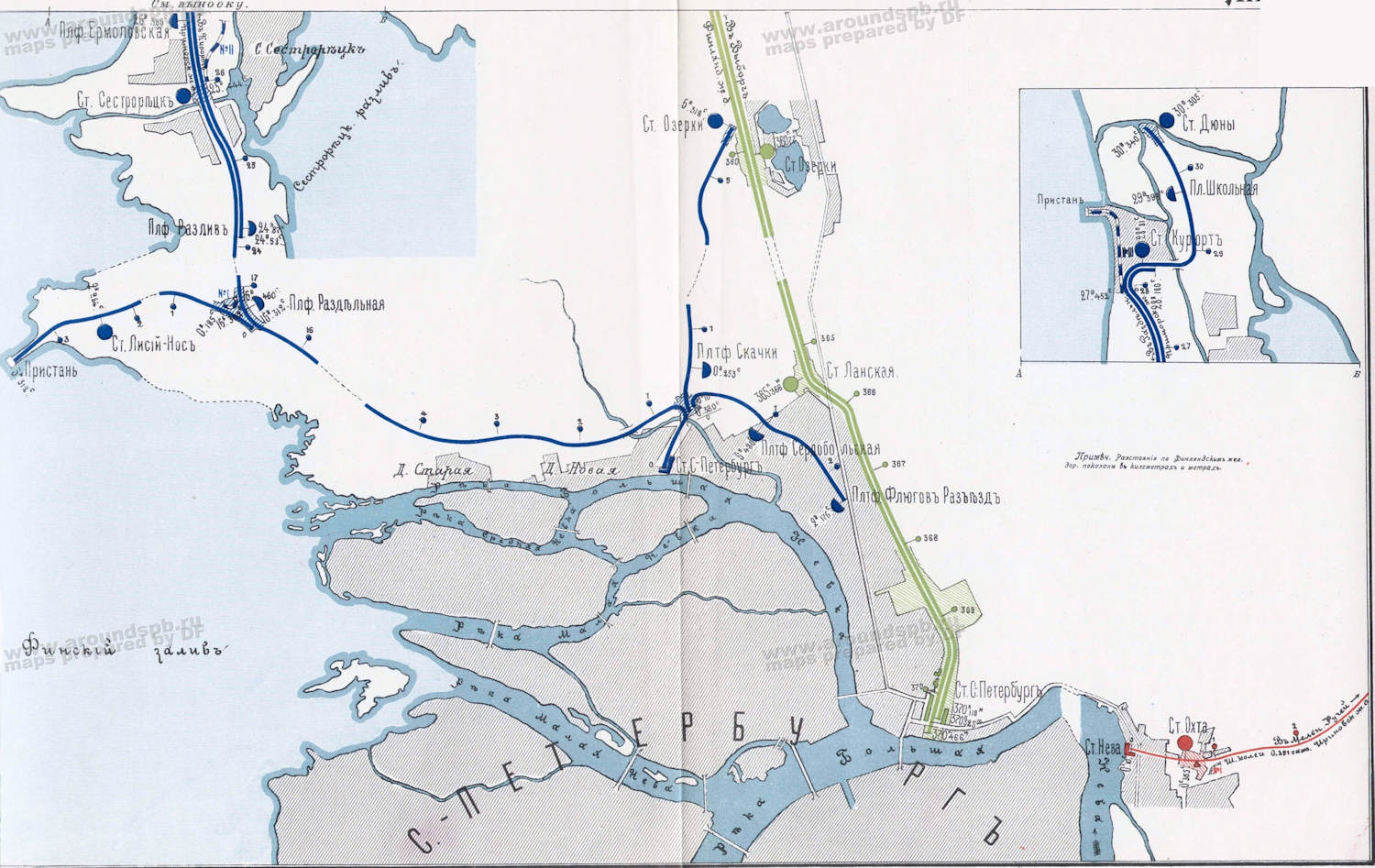 Посмотрел старые фотки, путевое развитие имели о.п. Горская, Гавань Миллера, Дюны, Ермоловская, Курорт, Лахта, Раздельная, Разлив, Сестрорецк.