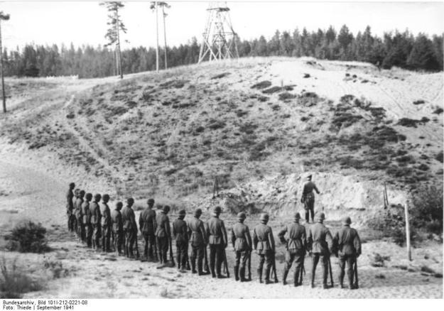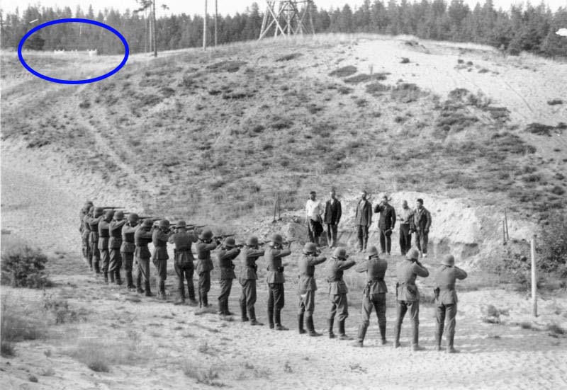 В сети уже давно гуляет серия фотографий из Бундесархива Bundesarchiv_Bild_101I-212-0221-хх. Помогите определить место расстрела партизан. Группа армий «Север», ?сентябрь? 1941 года. Фамилия фотографа Thiede PK 694 ( возможно, G.Thiede). Важно всё-назначение здания с таким количеством дверей, знакомые лица старших офицеров на фото, местность, где в наших краях столько песка...