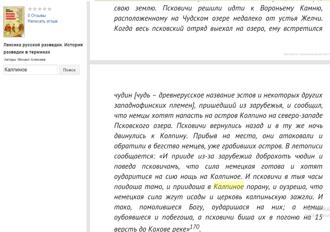 Цитата:..В Псковских летописях есть упоминание о том, что в 1463 г. после нападения немцев на Кобылу псковичи получили весть о готовящемся набеге немцев на «Калпиное», «и псковичи тыя часы поидоша тамо, и приидоша в Калпиное по рану, и утреша, что немецкая сила жгут исады и церков калпиньскую зажгли. И тако, помолившеся Богу, ударишася на них; а Немци убоявшеся и побегоша, а псковичи биша их в погоню на 15 верст до Кахове реке.» Погост Колпино упоминается в Писцовых Книгах 1585-87 гг. как центр Колпинской губы Завелицкой засады[5].