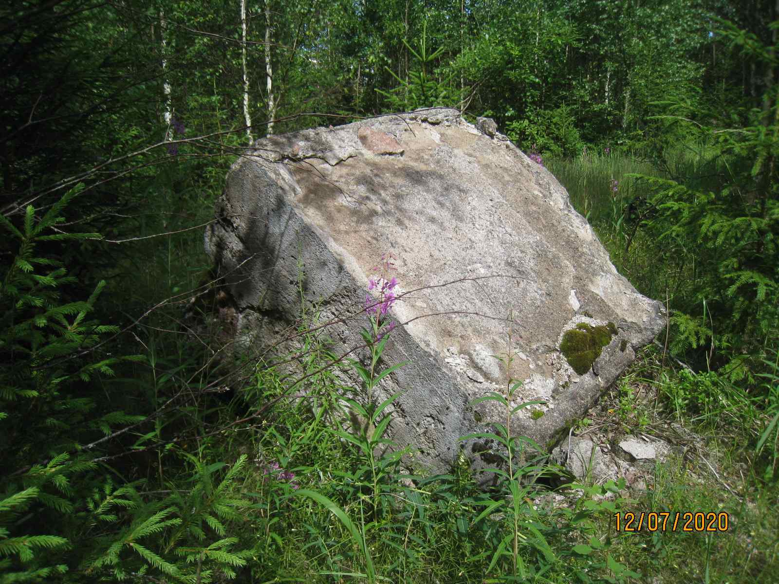 Встретилось вот такое рукотворное изделие: как-будто основание для чего-то делалось из цемента (весьма качественного, раз так хорошо сохранился), но зачем на него обычный камень затащили и крепко цементом соединили, раз камень не отвалился от основания за столько лет? Или может был цельный камень и ему придали цементом с одной стороны форму основания?