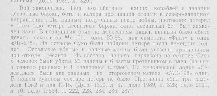 Там скорее всего какая-нибудь второстепенная информация типа флотских газет или тому подобное. Все утверждения из приведенного фрагмента опровергаются известными на сегодня источниками, в первую очередь мемуарами самого командира гарнизона Гусева. Из известных мне авторов больше всех занимались этим вопросом Ковальчук и Толокнов, но и они ничего в архиве по бою на острове не нашли. Была наукообразная статья о бое самого командующего ЛВФ Черокова ("Противодесантная операция у о.Сухо"), автор там фигурирует как доцент, но даже там все ссылки на ЦВМА не имеют отношения к бою на острове и источник описания боя неизвестен. Те пишущие исследователи из много работавших в ЦВМА (по теме Ладоги), с которыми мне приходилось общаться, говорили, что не встречали ничего по острову и обещали сообщить, если такое попадется. Но до сих пор известий не было. Поэтому напрашивается вывод, что эти документы где-то в закрытых фондах и исследователям недоступны.