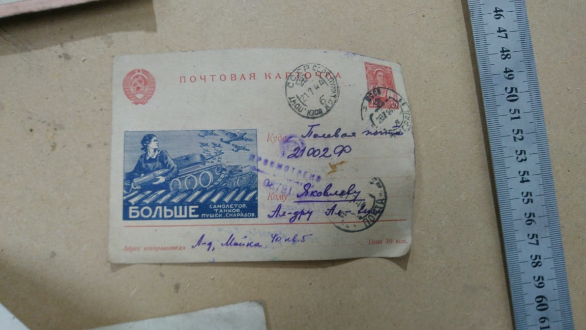 Сюжет предварительно понимаю так. Жили братья в Москве, одного направили в Петербург управляющим водоканала. У него был сын (расстрелян), жена и дочь(упоминаются в письме) как дядей и тётей из Ленинграда. Письмо одно из мединститута, а другое - из танковой учебки. Но адресат по линии родственников в Москве. Всплывает фамилия Яковлев. Он хорошо знает своих родственников в Ленинграде. Но письма с московским адресатом - оказываются на чердаке дома в Отрадном.