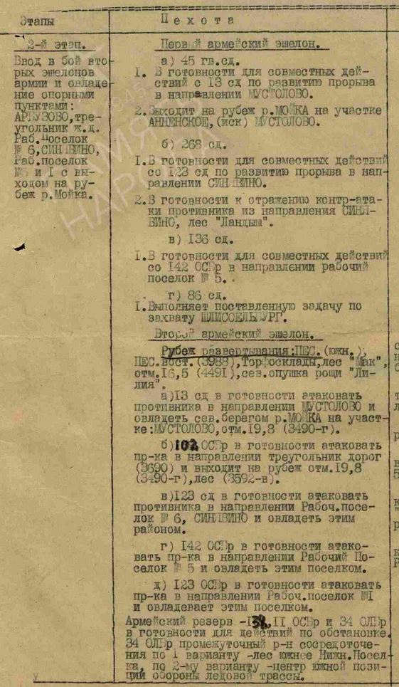 Что он означает. На первом этапе прорвать оборону противника и соединится. Потом совместными усилиями подготовить другую операцию, создать плацдпрм. п. Синявино, как главного удара нет.