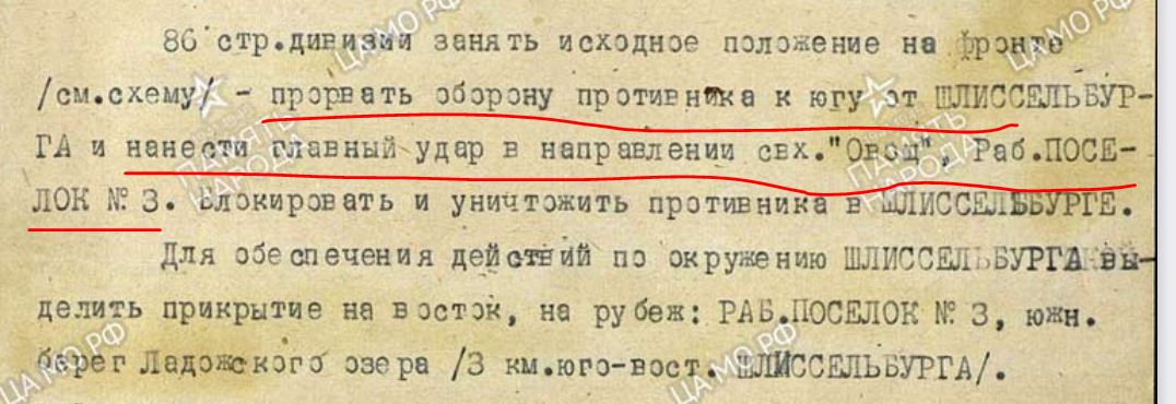 Что-то не заметил ни одного документа ставки. Возможно они затерялись до незаметности в Вашем труде, и это печально для таких важных документов. Неужели там Шлиссельбург указан, как главная цель? Странно, что Духанов осмелился игнорировать это указание, ставя задачу для 86-й дивизии: