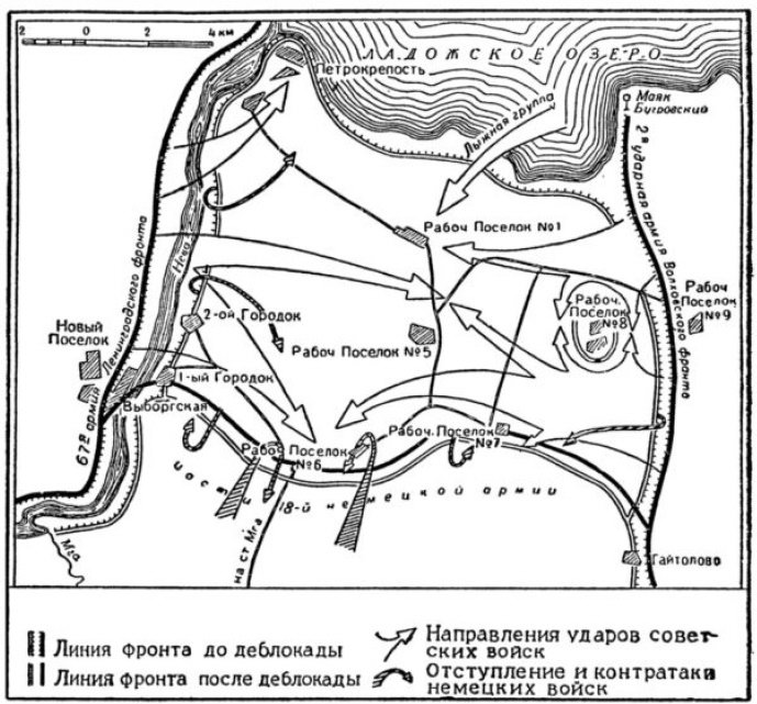 Излагая основное содержание замысла предстоявшей операции. Военный совет указывал, что наиболее выгодным направлением для нанесения удара следует считать шлиссельбургское, с организацией прорыва на участке 1-й Городок, Шлиссельбург (ширина участка 10 км), а для Волховского фронта - на участке Липка, Мишино, с развитием обоими фронтами удара на Синявино. Осуществление прорыва вражеской обороны на указанных участках и его развитие в общем направлении на Синявино лишило бы противника возможности наносить фланговые удары по нашим наступавшим войскам со стороны Ладожского озера.