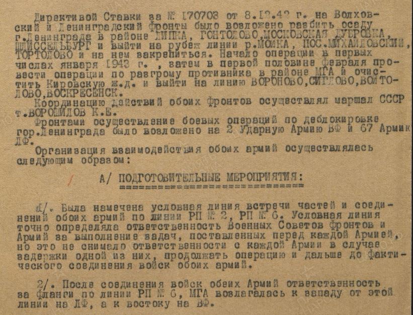 Директивой Ставки Верховного Главнокомандования от 8 декабря 1942 года Ленинградскому и Волховскому фронтам было приказано одновременными ударами с запада и востока разгромить