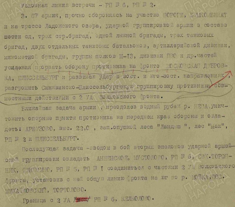 С одной стороны нигде не встретилось упоминание конкретной задачи, действия соединений второго эшелона вообще не упоминаются. Волховский фронт вообще наносил фронтальный удар всеми дивизиями и ставил цель - выход к Пиль.Мельнице, т.е. к Неве. Такое ощущение, что на 67А особых и задач не возлагалось.
