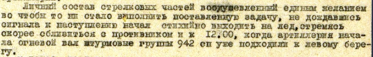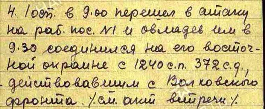 «...в результате чего к 12.00 соединились с частями 372 СД Волховского фронта в районе севернее и южнее РАБОЧ. ПОСЕЛОК № 5.»