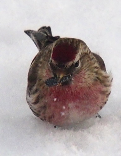Этой зимой кормушку по-прежнему посещали синицы, лазоревки, снегири (всегда парами) и воробьи (полевые).А на снегу под кормушкой впервые заметил стайку мелких (с воробья) птичек с красной грудкой.