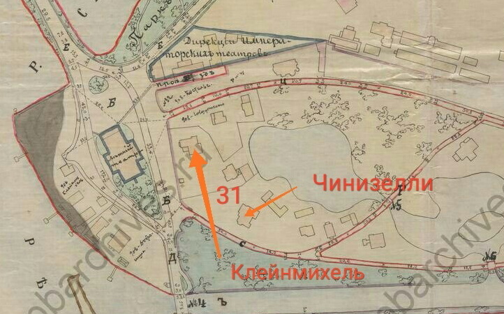 Допустим, так оно и было. Но при углублении сначала в справочники Весь Петербург, а потом и в архивные дела выясняется, что Клейнмихель владела двумя участками - слева и справа от театра. По разным сторонам площади. Обсуждаемый участок на берегу имел №24, а с другой стороны - №31. Тут и начинается путаница. Или вопросы. 24 участок Клейнмихель разделила с некоей Ильиной, которая отдала его Добрыниной еще в 1901-м году (24 и 24а). Есть архивное дело на этот счет. Там и так было немного места, Клейнмихель даже намывала берег для расширения территории, это видно на плане 1911 года. Какая же тут еще Чинизелли? Но это не все. 31 участок с другой стороны площади согласно делу в архива ЦГИА как раз и был поделен с Люцией Чинизелли. На плане 1902 года он еще весь за графиней, а в 1911-м уже разделен и застроен.