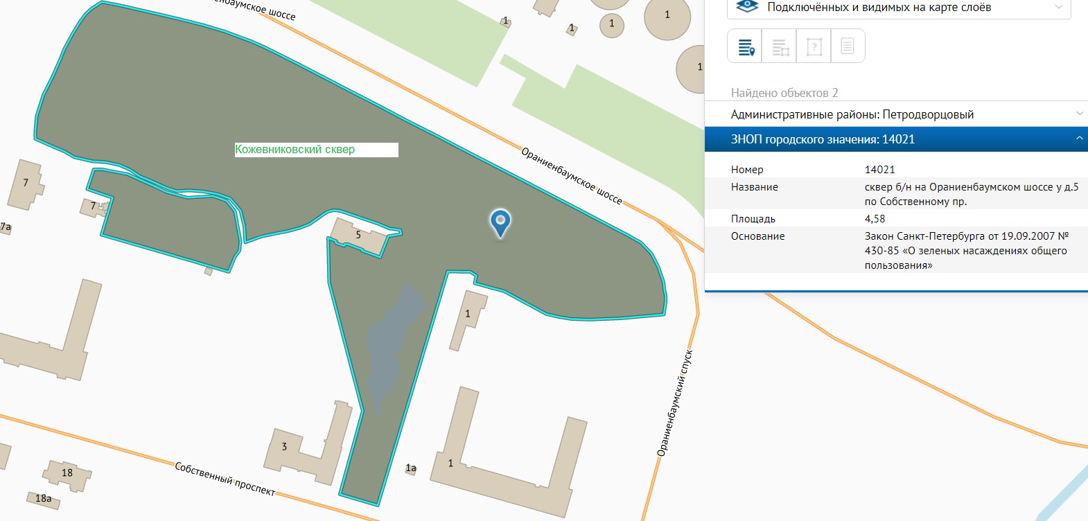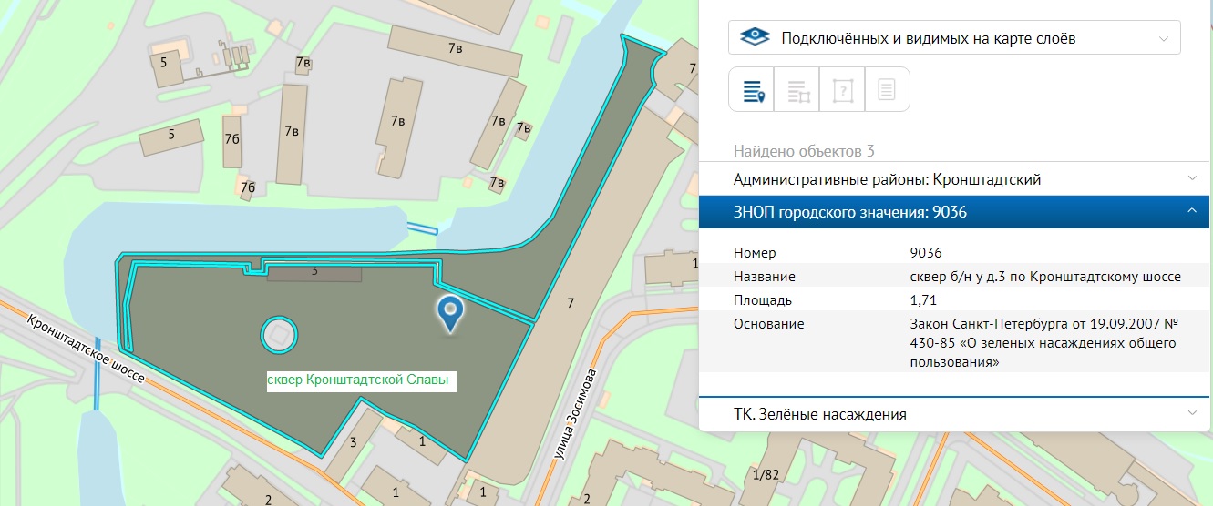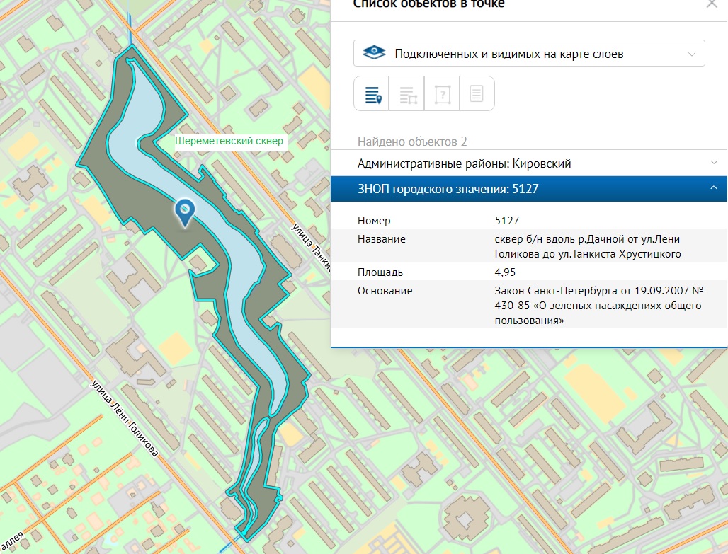 Скверы: Анфисин, Ваза, Генерала Андреева, Голодаевский, Ивана Шинкарёва, Кожевниковский, Кронштадской Славы, Метеорологов, Петра Егорова, Псковских Десантников, Финансистов и Часовщиков, а также Шереметевский. Больше ничего.
