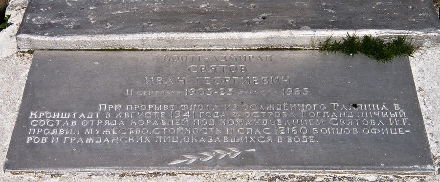 Текст на памятной доске: "Контр-адмирал Святов Иван Георгиевич (11 сентября 1903 - 25 августа 1983). При прорыве флота из осажденного Таллина в Кронштадт в августе 1941 года у острова Гогланд личный состав отряда кораблей под командованием Святова И. Г. проявил мужество, стойкость и спас 12160 бойцов, офицеров и гражданских лиц, оказавшихся в воде". С начала войны капитан 2 ранга И. Г. Святов был начальником штаба Отряда легких сил Краснознаменного Балтийского флота. Во время "Таллинского перехода" КБФ он командовал Отрядом прикрытия (5 СКР, 14 ТЩ, 6 ТКА, 5 МО, 3 буксира), базировавшимся на о. Гогланд. В ноябре-декабре 1941 г., находясь в должности командира Охраны водного района Главной базы КБФ, активно участвовал в организации эвакуации гарнизона ВМБ Ханко, командовал отрядом кораблей, базирующимся на Гогланд. В декабре 1941 г. руководил эвакуацией гарнизонов островов Финского залива. С 1960 г. в запасе. Урна с прахом И. Г. Святова по его завещанию опущена в воды Финского залива у острова Гогланд.