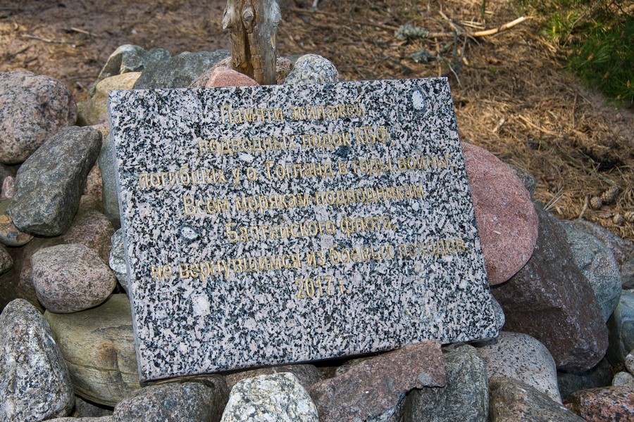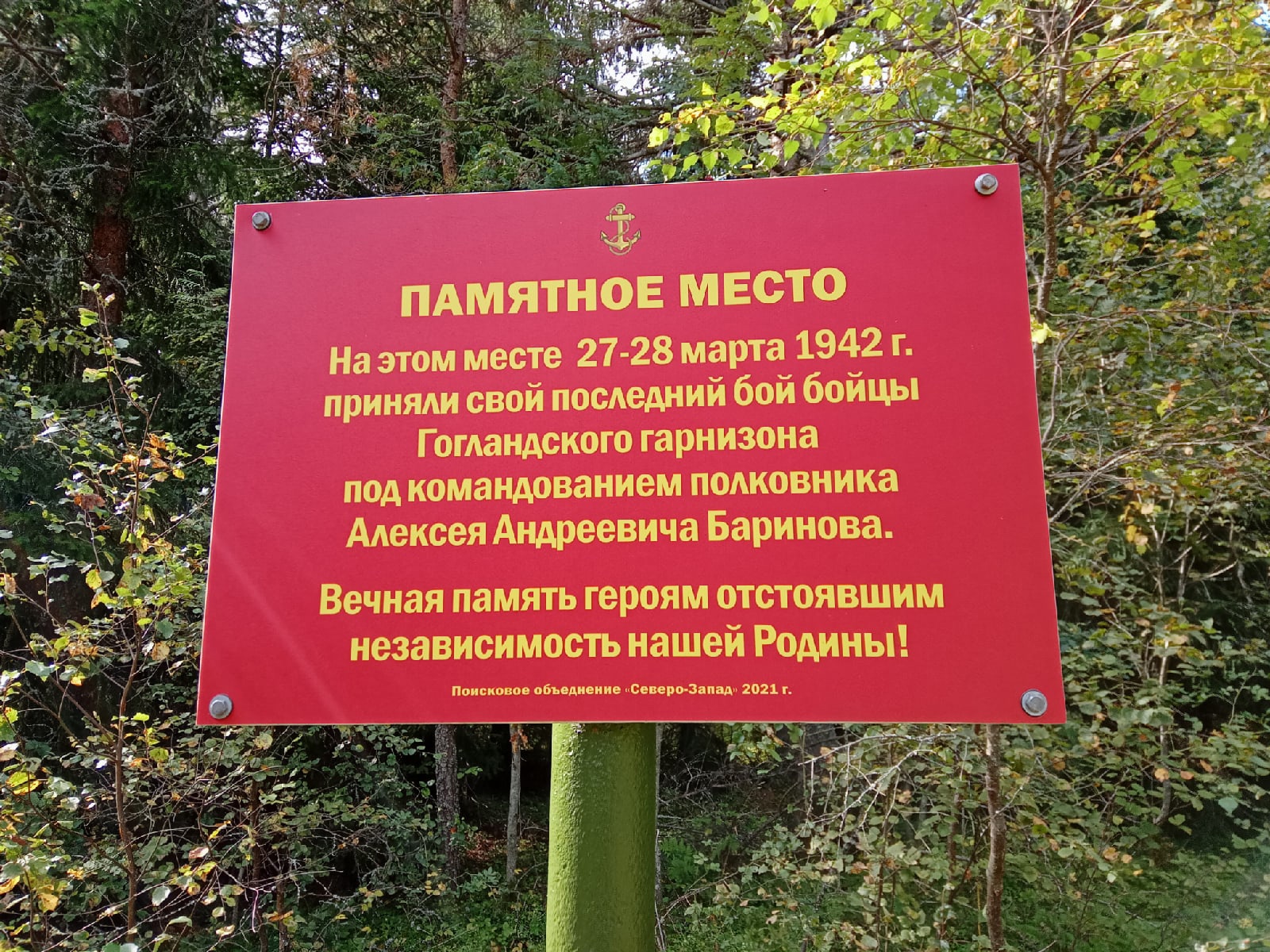 "На этом месте 27-28 марта 1942 г. приняли свой последний бой бойцы Гогландского гарнизона под командованием полковника Алексея Андреевича Баринова.