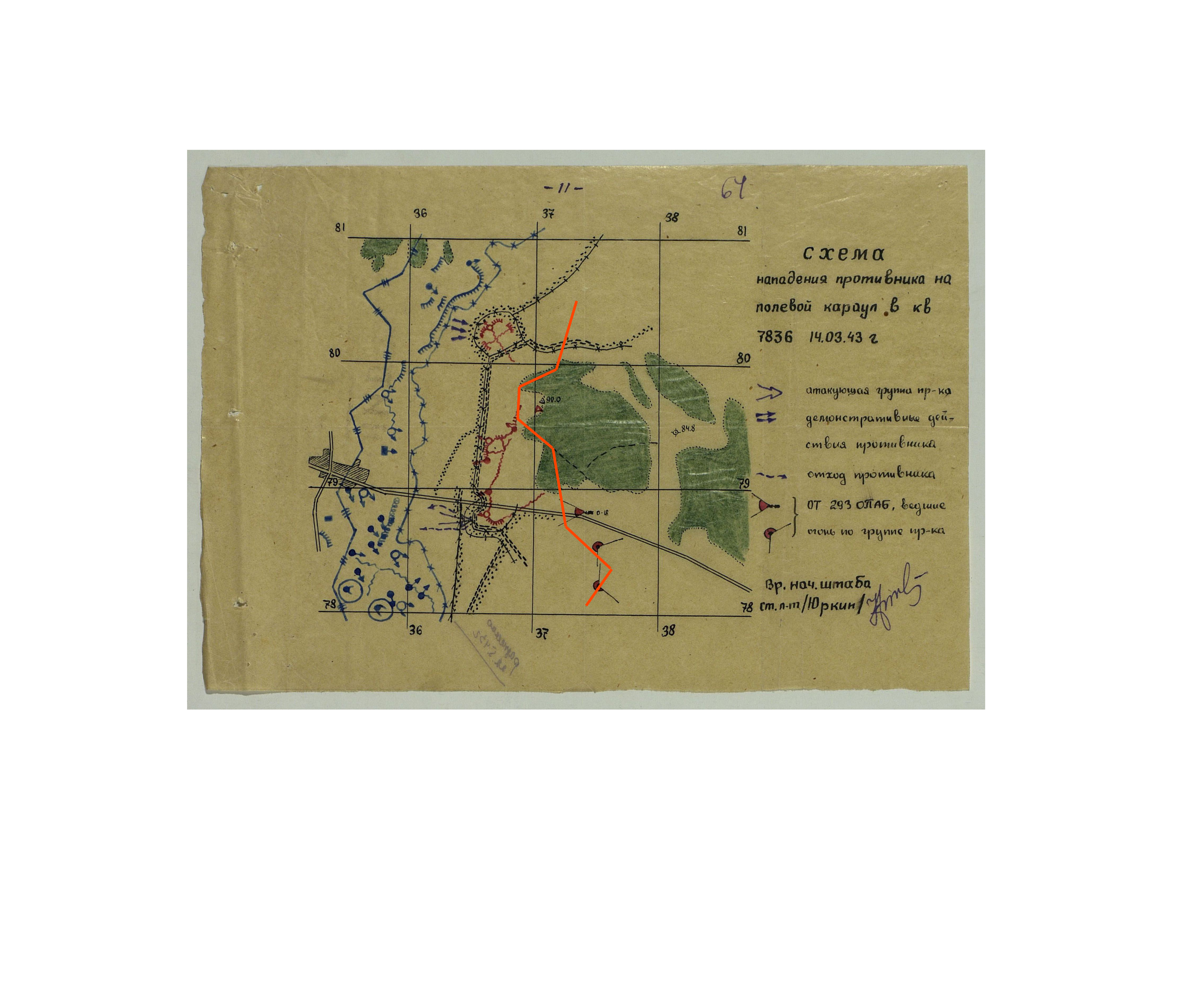 Рис.4 - Схема эпизода боевых действий с показанной полевой обороной, находящейся вне связи с линией надолбов (линия существующих ныне надолбов показана красной линией).