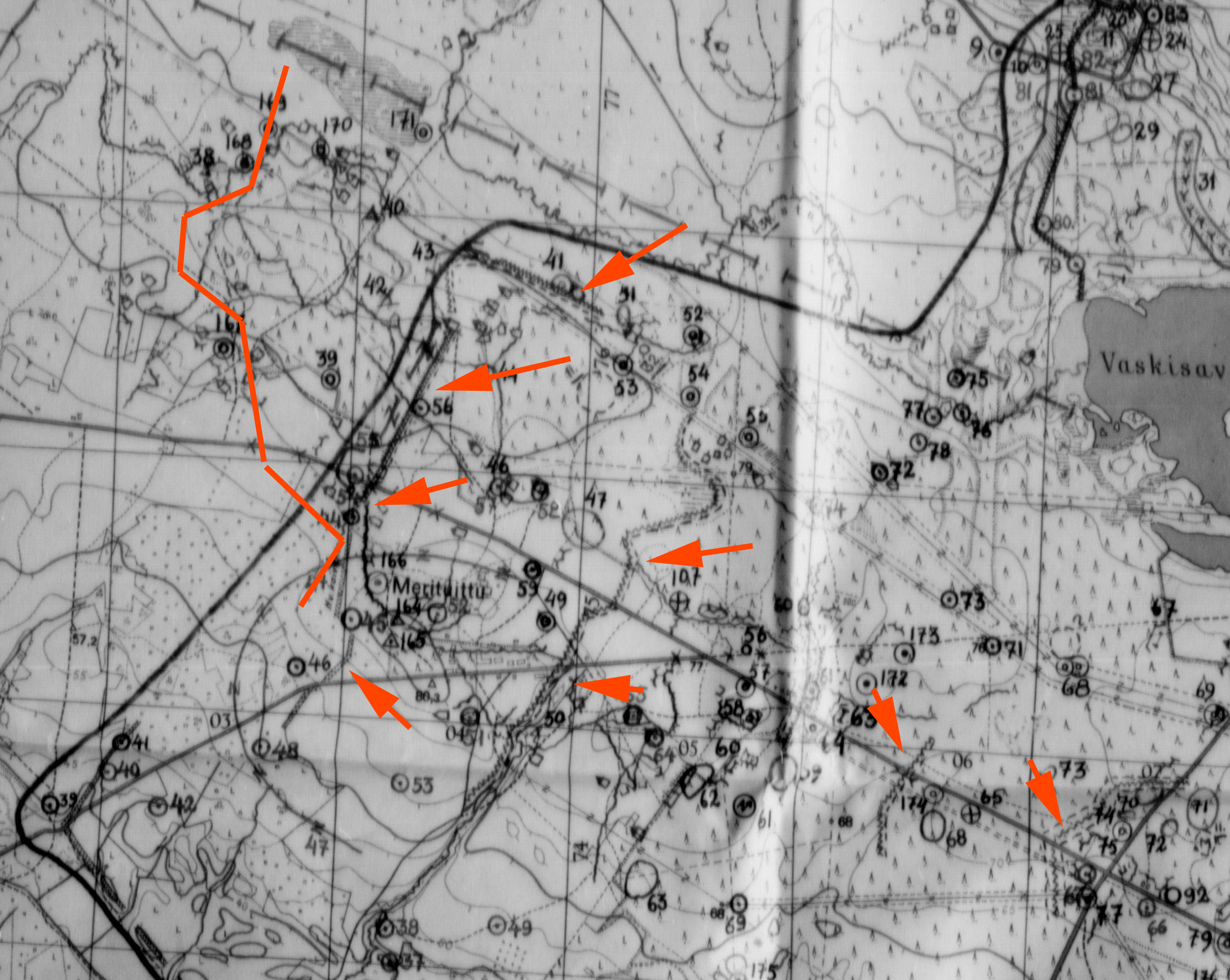 Рис.5 - Финская разведкарта, показывающая укрепления в Мертути. Красные стрелки показывают существовавшие противотанковые рвы, линия существующих ныне надолбов показана прозрачной красной линией, но на схеме не отмечена.