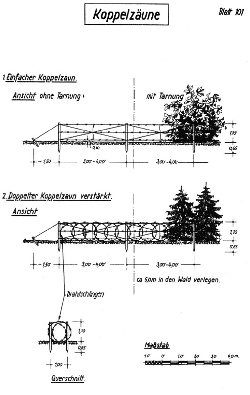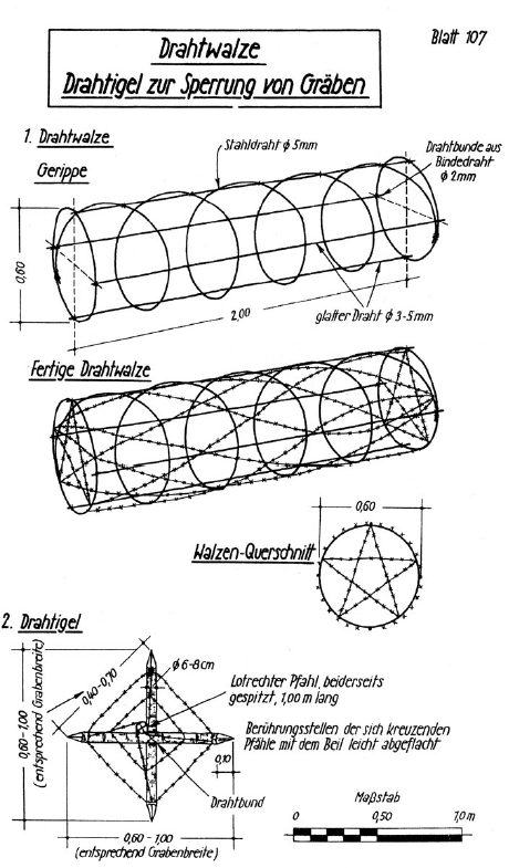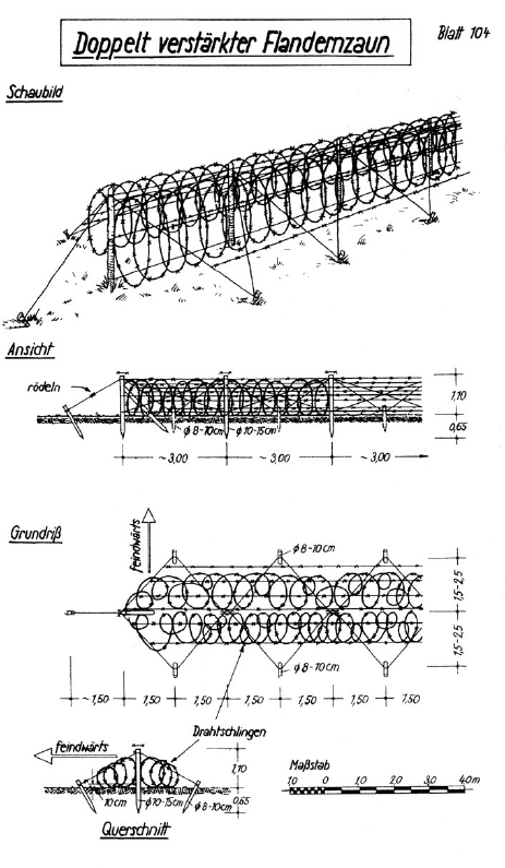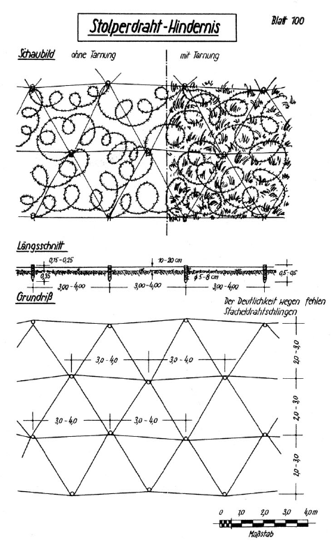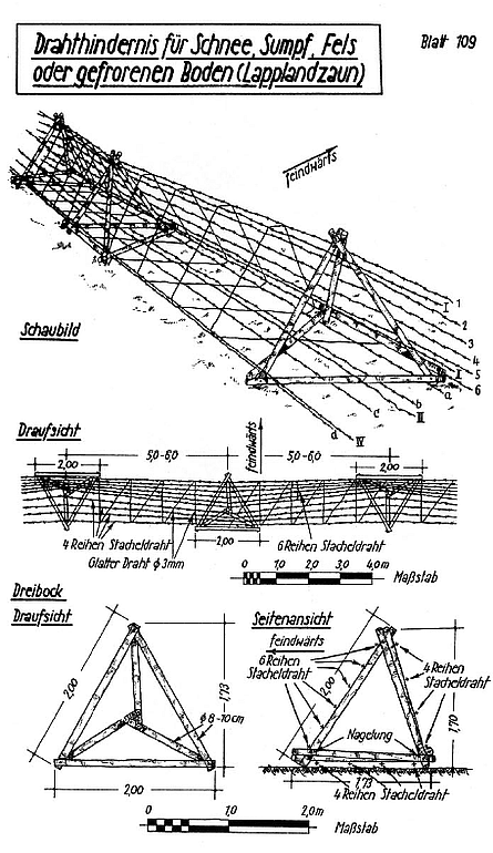 Описание инженерных сооружений немцев, перед фронтом полка- стр 29-30. Проволочные заграждения в виде рогаток в 3-4 ряда, на удалении от передних траншей на 30-40 метров. В непосредственной близости от траншей разбросана спираль Бруно, на отдельных участках минные поля, лесные завалы и заборы. На опасных для противника участках, установлены рогатки усиленные в виде спиралей, колючей проволокой, нитка от нитки 3-4см, представляющие собой проволочный забор, сильно затрудняющий его резку и преодоление. Траншеи 1.5-2м глубиной с большой сетью открытых площадок,дзотов и блиндажей. Теперь становится понятно, почему взятие контрольного пленного проходило на отдельных участках, как мини боевая операция. Примеры типовых полевых проволочных и маскировочных заграждений вермахта.
