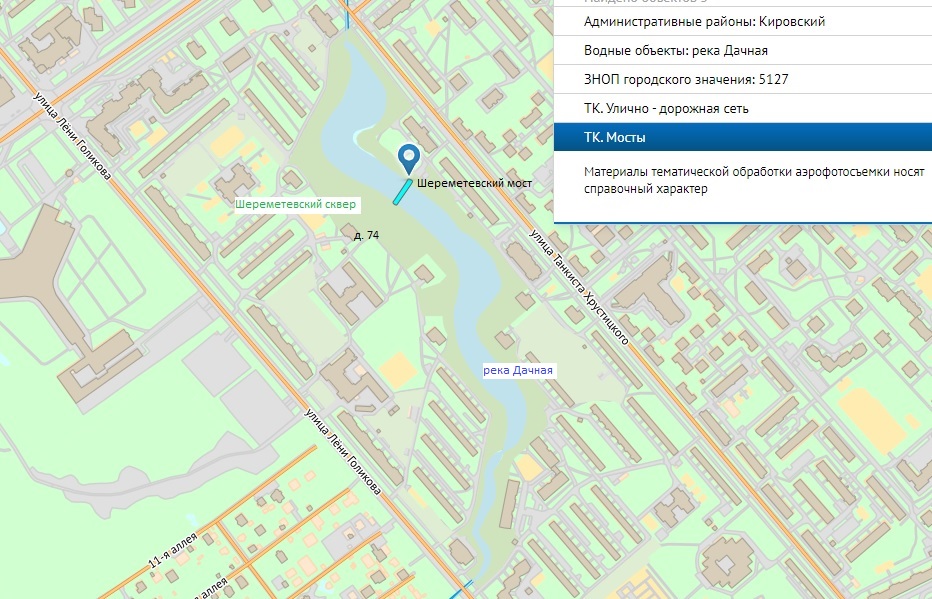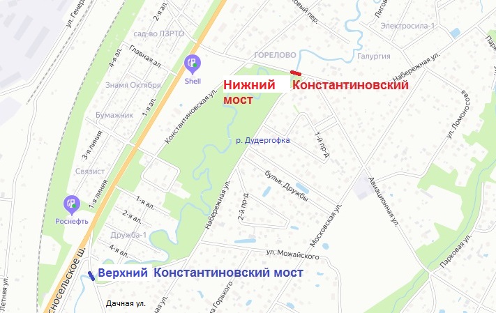 Белый мост, Клиновский мост, Верхний Константиновский мост, Нижний Константиновский мост, мост Красный Судостроитель, Митрополичий мост, Порховский мост, Староорловский мост, Шереметевский мост, Белоостровский мост, Дюнный мост, Ольхин мост, Серебряный мост (Белоостров), Гагаринский мост, Ермоловский мост, Курортный мост, Оружейный мост (Сестрорецк), Редугольский мост, Таможенный мост (Сестрорецк и Белоостров), Танковый мост (Песочный), Зареченский мост (Понтонный), Мельничный мост (Петро-Славянка), Меншиков мост (Усть-Ижора), Рамбюров мост (Колпино), Ленсоветовский мост, Шушарский мост (Шушары), Нововестинский мост (Тярлево и Шушары), 1-й Базенов мост, 2-й Базенов мост (Тярлево), Александровский мост, Гоночный мост (Александровская), Баболовский мост, Соболевский мост (Пушкин), Поповский мост, Пязелевский мост (Павловск), Кикенский мост, Лемановский мост, Орловский мост (Стрельна), Скачкинский путепровод, Яльгелевский путепровод (Красное Село)