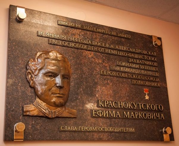 В тот же день в школе № 462 была торжественно открыта мемориальная доска Герою Советского Союза Ефиму Марковичу Краснокутскому, командиру 59-го полка. На мемориальной доске размещён бронзовый барельеф героя, текст отлит также из бронзы и размещён на матовых лентах [там же].