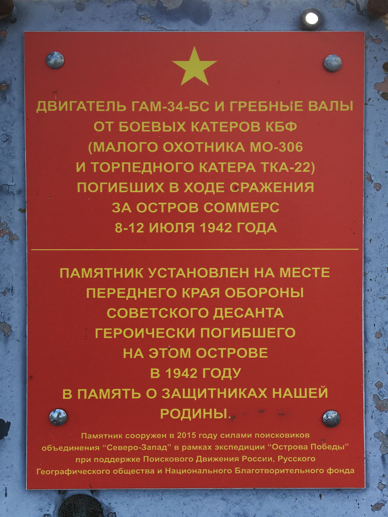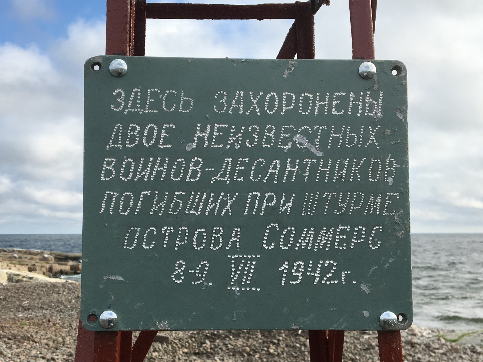 "Здесь захоронены двое неизвестных воинов-десантников погибших при штурме острова Соммерс 8-9.VII 1942 г."