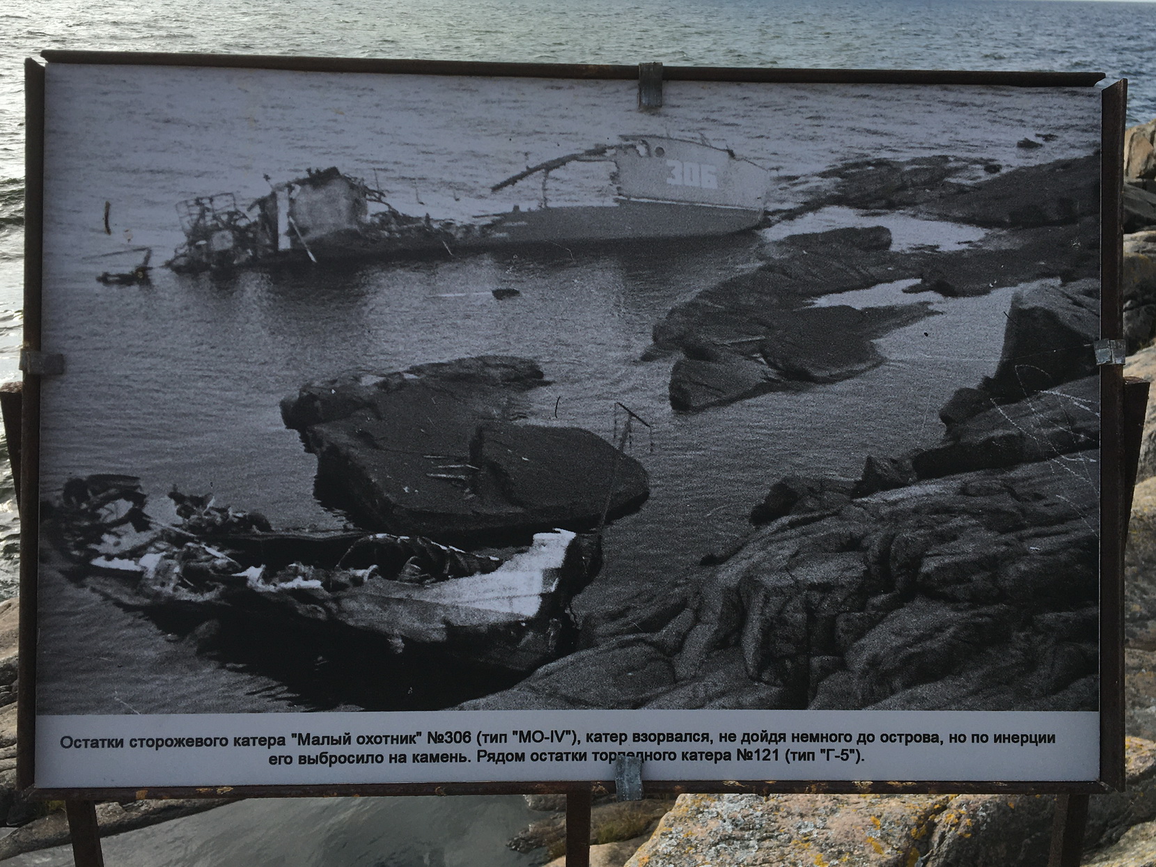 Остатки сторожевого катера "Малый охотник" № 306 (тип МО-IV), катер взорвался, не дойдя немного до острова, но по инерции его выбросило не камень. Рядом остатки катера № 121 (тип "Г-5")