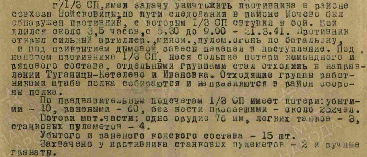 2. В 19.30 закончился бой в районе леса вост. Бол.Борница в результате боя наша пехота отошла в район ст.Войсковиц. В этом районе действовали части НКВД и 2 гвардейской дивизии. Со стороны противника действовало около 50 тяжелых и легких танков. По словам командира 2-го батальона танк КВ подбил 18 танков пр-ка. Один танк КВ вышел и строя по техническим причинам и , кажется, остался у пр-ка.