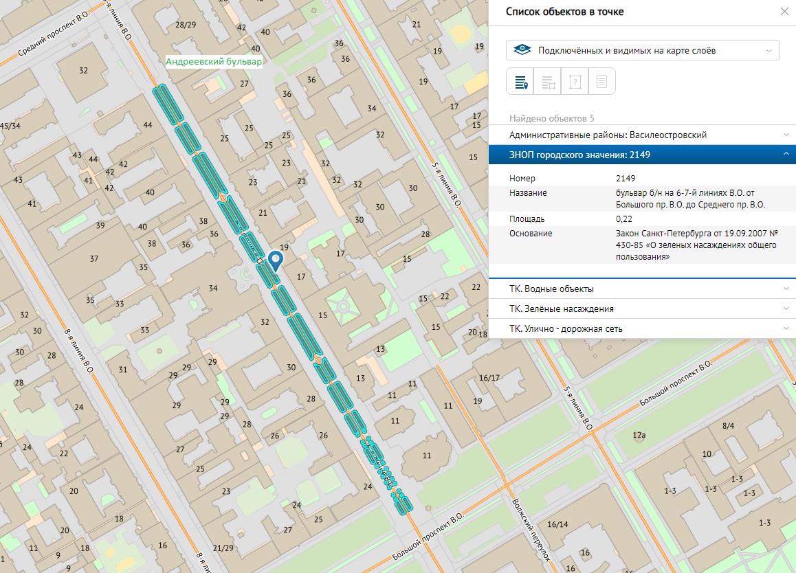 Андреевский бульвар, сквер Анны Зеленовой (Павловск), сквер Владимира Шалимова, Дёминский сад (участок 2), Джазовый сквер, сквер Знаменова (г. Петергоф), сад особняка Кирштена, аллея Ленинградских Зенитчиц, сквер Маринеско, сад Милосердия, сквер Михаила Боброва, сквер Нины Соколовой, Прядильный сквер, сквер Слепых Слухачей, Троицко-Петровский сквер, сквер Юрия Кнорозова, сквер Юрия Сенкевича