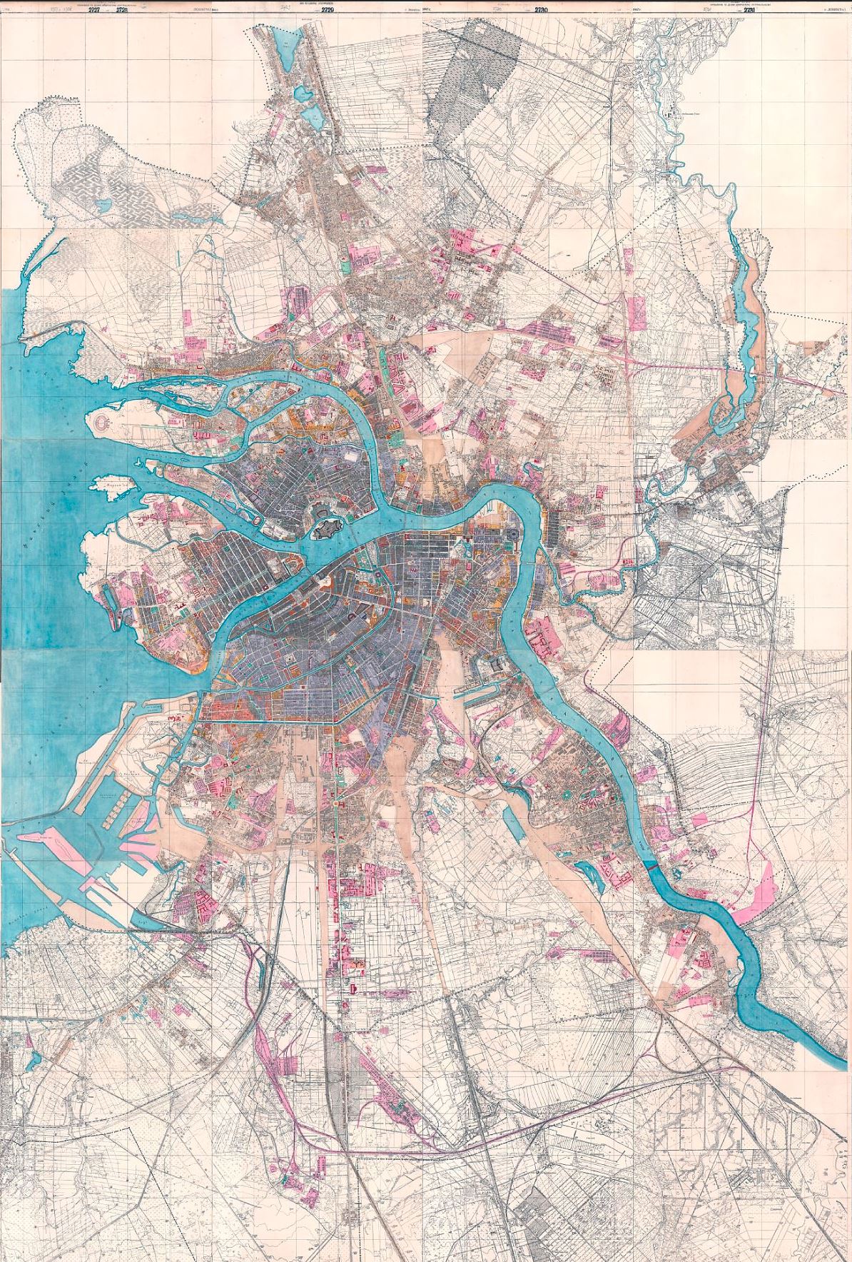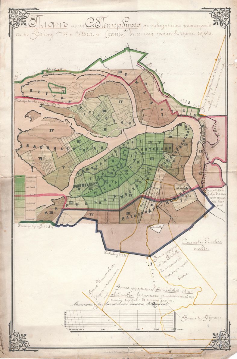 Разбирая антресоли, обнаружил любопытный "План города С.Петербурга с показанием расширения его по Закону 1768 и 1833 г.г. и (сепью) выгонныя земли в черте города". Размер - 507*335 мм, отпечатан в "Фото Лит. Н. С. Егорова, СПб, Разъезжая, 37". Год не указан; судя по дополнениям 1886 года - конец XIX века. Отсканировал по частям и "склеил". Такое впечатление, что создатели плана наклеили на лист ватмана вырезанную где-то карту плотности населения (в кв. саженях на 1 жителя), а затем от руки дорисовали окраины, подписали некоторые объекты (напр., "Городская брандвахта"), нанесли границы города и указали "сепью" (сепией?) - выгонные земли. Добавили масштабную шкалу, заголовок и в таком виде сдали в печать. Полный размер - https://disk.yandex.ru/i/nyj6_s4kJcPFWg