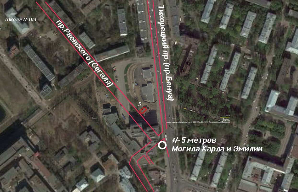 На месте диспетчерской будки стоит дореволюционный кирпичный дом №5 по Раевского. Белым кольцом помечено наиболее вероятное место могилы Карла и Эмилии с ориентиром "старая лиственница под стенами НИИ Цитологии".