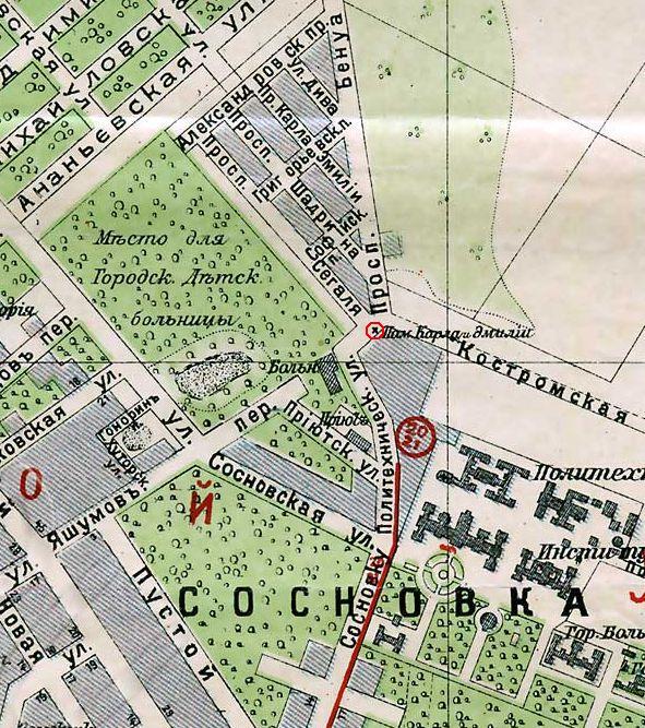 Romualdo >Как видно из карты, проспект Бенуа (Тихорецкий) и Политехническая ул в месте соединения делают крутой изгиб, которого сейчас нет, поэтому могила Карла и Эмилии действительно находилась на месте существующего сейчас трамвайного кольца, в месте примыкания пр.Раевского (Сегаля) к Тихорецкому пр. Примечательно, что мы не видим на этой карте Ольгинских водоемов, на их месте планировалось строительство детской больницы.