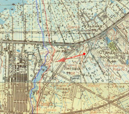 До немцев было 1100 метров. Старопановская операция 43 года тут вообще не при чем, на положение войск в районе Урицка она не повлияла. Передний край наших был примерно по Дудергофке, немцев-по Авангардной...Партизана Германа. На Жукова/Петергофском немцев не было никогда. До больницы Фореля крупнее разведгрупп никогда ничего не просачивалось. А амбразура жбота, в общем-то, в склон лощины не упирается; к тому же, форма лощины могла измениться после войны, при планировке территории парка Александрино.