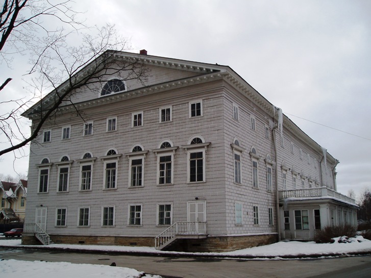 Н. А. Львов) и представляла собой прямоугольное в плане одноэтажное здание с повышенной центральной частью, включавшей двусветный зал. В 1813—14 к дому был пристроен монументальный 10-колонный портик ионического ордера с балконом (архитектор А. А. Михайлов 2-й)- вот так возможно и использовались разные материалы.
