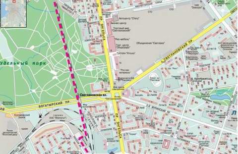 Между тем, если посмотреть по спутнику, ныне Светлановский проспект всё же имеет легкий изгиб на перекрестке с пр.Тореза.
