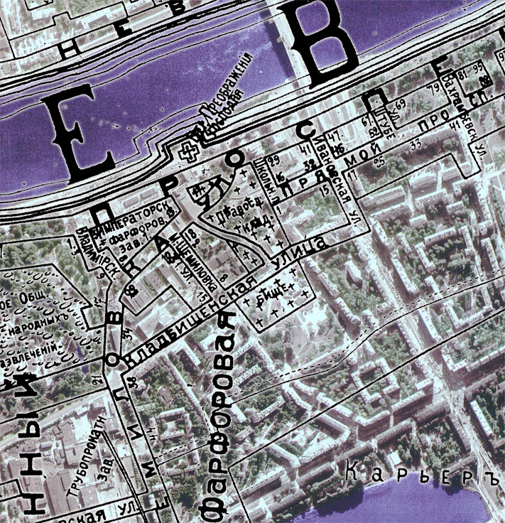 Разумеется, следов кладбища в архивах нет. Зато там есть документы, подтверждающие существование кладбища именно на месте нынешнего Ломоносовского сквера. Например, «докладная записка на президиум Володарского райсовета», 24 сентября 1938 года: «В Володарском районе на бывшем Спасо-Фарфоровском кладбище по Б. Щемиловке расположено здание церкви «Духа», которое было передано группе верующих, 20-ке Тихоновской ориентации, в бесплатное бессрочное пользование по типовому договору 8/III-28...». Архивный снимок церкви Сошествия Святого Духа, которая простояла до 60-х годов ХХ века почти в самом центре нынешнего Ломоносовского сквера, был недавно опубликован в нашей газете. На нем невооруженным глазом можно увидеть кресты Спасо-Преображенского (Фарфоровского) кладбища.