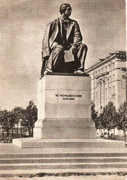 Есть открытка места перед нынешней "Россией" примерно 1948 г.Чернышевский уже сидит,а сзади - хилые деревца и стройплощадка. Сбоку - дом,построенный перед самой ВОВ.