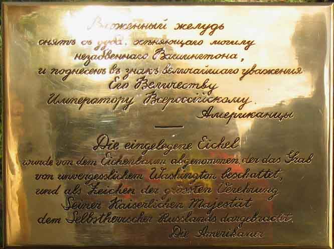 Тот дуб вырос из желудя от дуба, который рос на могиле Дж.Вашингтона и был дубок подарен Николаю 1 делгацией американцев.