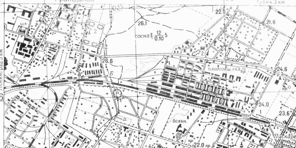На карте за нашими домами (между нашими домами и деревней Ручьи) обозначена полевая дорога, она шла на аэродром. Ни на одной карте я его ещё не встретил, но он был. Я его хорошо помню и вначале 60-х он был вполне действующим, конечно, не так активно действовал, как во время войны, никого уже не бомбили, но всё-таки – с него взлетали самолёты и планера, наверное, тогда он уже носил какой-то иной военно-патриотический смысл, типа, ДОСААФ. Вдоль этой дороги стояли телеграфные столбы. Кста, на фото «12_66» и «n29» тоже телеграфные столбы, а не ЛЭП. Телеграф – самое распространённое тогда средство связи, мы подходили к ним, прикладывали ухо к столбу и слушали, как гудят провода. Но была и высоковольтная ЛЭП, только где проходила, точно не помню. По карте, так она шла от Ручьёв через поле в сторону аэродрома. Пунктиром обведено место, где тогда располагался аэродром, но никаких опознавательных знаков нет.