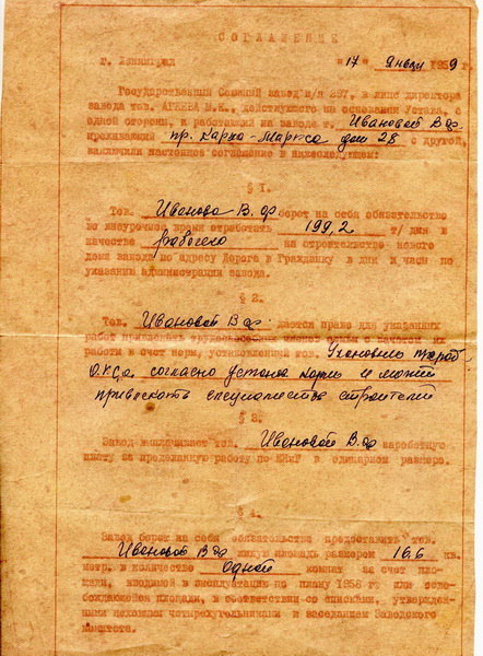 За не полных двести трудодней можно было найти крышу над головой с площадью чуть больше шестнадцати метров! А дата составления соглашения - январь 1959 года, т.е. время строительства – 1959 год, ну а въезжали мы в конце этого же 59 года. А как вам формулировочка – «в соответствии со списками, утверждёнными цеховыми четырёхугольниками и заседанием Заводского комитета». Тройки тогда уже что, вышли из доверия что ли? И всё зашифровано, не заводы, а сплошные почтовые ящики.