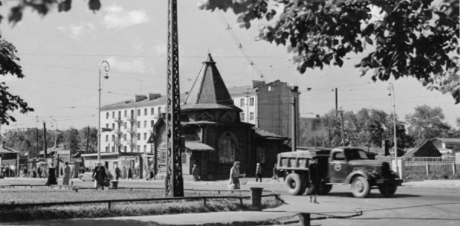 Похоже - грузовики ЗИС-155 кажется тогда уже начали выпускать. А церковь (не часовня!) просуществовала вероятно до середины 1950-х. Кстати, где-то слышал, что эта церковь (или аналогичная по архитектуре на ее месте) едва ли не старше Петербурга.