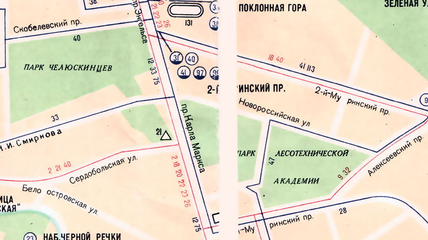 Фотка с трамваем МС+2ПС - видимо начала 1950-х. Маршрут №18 ходил именно так с первых послевоенных лет до 1975 г. До конца 1960-х маршрут был такой: "Балтийский з-д — 22-23 линии — Средний пр. — Тучков мост — Чкаловский пр. — Карповка — Гренадерский мост — пр. Карла Маркса — 2-й Муринский пр. — дорога в Сосновку — Политехнический ин-т".