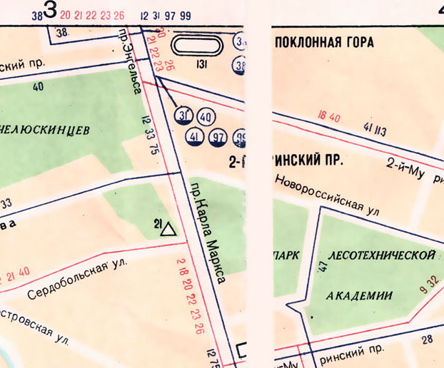 Карта 1962 г в северной части, нарисована явно из экономии бумаги. Долго смотрел на стадион, пока не прочитал, это ныне разрушенный велотрек. Авторам карты разместить объект с севера на юг возможности уже не было, да и от Скобелевского до 2-ого Муринского шаг шагнуть.
