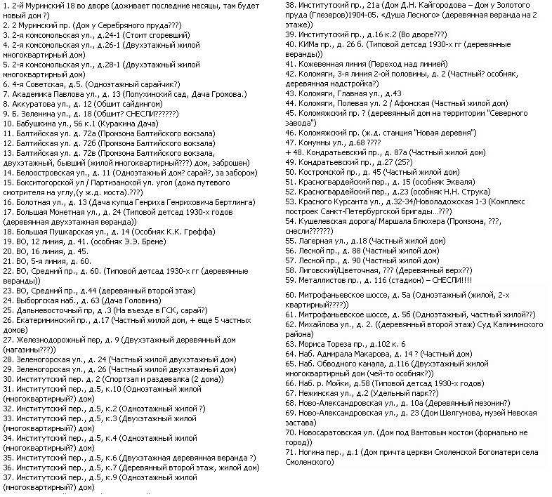 Я сюда не включала садоводства, еще оставшиеся в черте города - их хочется учесть отдельно, и Каменный остров, который тоже требует особого внимания. В этом списке присутствует жилая и нежилая (во всех смыслах) историческая застройка нашего города (без новоделов, в том числе церквей и часовен). Города-спутники, недавно формально вошедшие в городскую черту тоже не учитывались сознательно - только территории в пределах Ленинграда.