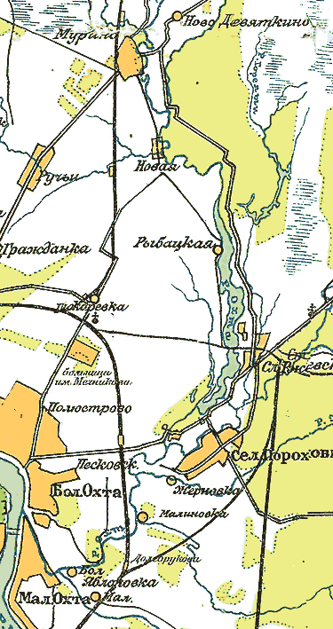 Меня очень интересуют другие притоки. На карте окрестностей Петрограда (Гаша) ясно (https://www.aroundspb.ru/maps/okr_spb/t_okr_spb_05.jpg) виден неотмеченный на более современных картах (на сайте я не видел, по кр.м.) приток Охты, южнее Жерновки, начинающийся у населенного пункта Малиновка и доходящий аж до Яниной колонии (там в конце он разветвляется на два небольших ручейка, похоже на раздвоенное жало). Вот в том конце, примерно в километре к югу от нынешнего Янино-1 (на глазок на этом месте стоит сейчас асфальтовый завод, какой-то водоканаловский склад и еще что-то) до сих пор есть какие-то бойкие ручейки. Думаю, что остатки "безымянного" притока. Очень бы хотелось узнать про приток подробней!