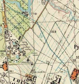 Вот для начала кусок топокарты этого района 1961 г.(в нижнем правом углу - будущая "Академическая"). Ничего интересного,за исключением противотанкового рва и ЛЭП,существующей поныне(частично). Поля, поля...